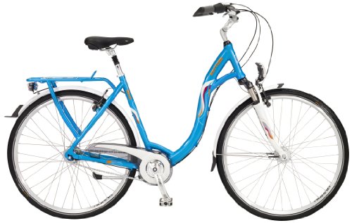 The Kettler® Nena women's comfort bicycle is designed to get you just about anywhere in comfort and style, if not outright speed. It's designed around a 47-cm aluminum frame, and its 7 speeds are controlled by a Shimano® twist shifter; the suspension fork and seat post take out the shocks and big bumps. The Nena also includes extras, such as a luggage rack, dynamo-lit front and rear lights, and a clear chain cover.
